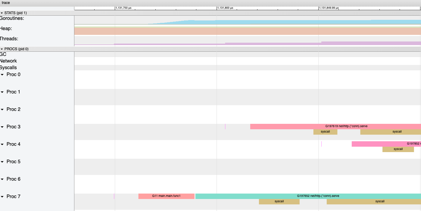 Below that, in the “PROCS” section, we can see how the execution of goroutines is mapped