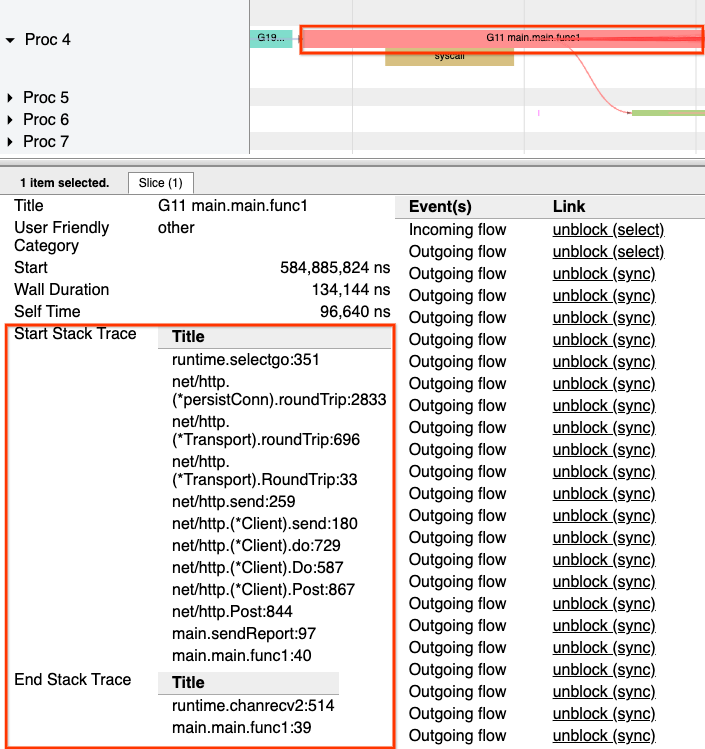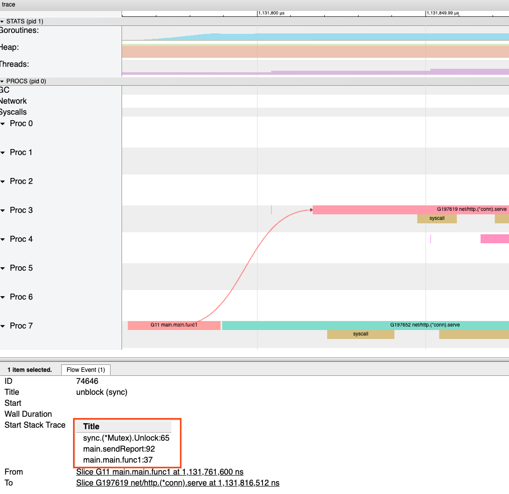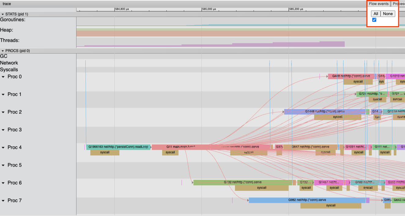 In addition to the activity of each individual goroutine, we can see how goroutines interact via “flow events.” An incoming flow event indicates what happened to make a goroutine start running. An outgoing flow edge indicates what effect one goroutine had on another. Enabling the visualization of all flow events often provides clues that hint at the source of a problem.