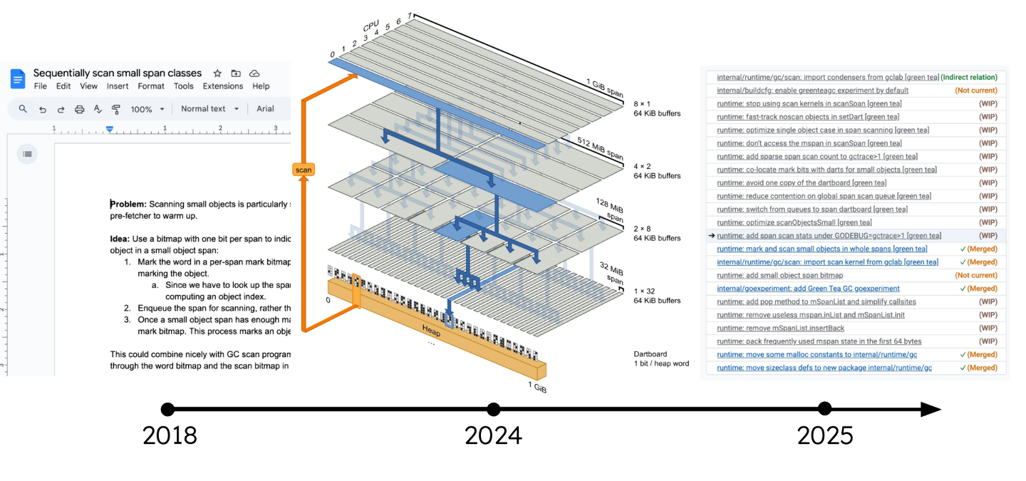 But that’s not true at all. Green Tea is the result of work and ideas from many people over several years. Several people on the Go team contributed to the ideas, including Michael Pratt, Cherry Mui, David Chase, and Keith Randall. Microarchitectural insights from Yves Vandriessche, who was at Intel at the time, also really helped direct the design exploration. There were a lot of ideas that didn’t work, and there were a lot of details that needed figuring out. Just to make this single, simple idea viable.